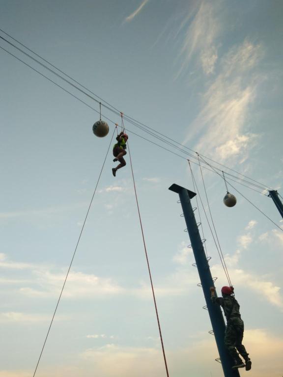 随后,在基地教练的带领下进行素质拓展。简单热身之后,分别进行了翻卡片、高空挑战以及“攻防箭”对抗三项活动。翻卡片活动分为三轮,困难程度逐次增加;之后在各自团队的鼓舞下突破大家自我极限、克服高空恐惧,成功完成高空挑战;最后每分队分成两组七人小队,逐一与其他队的小组进行“攻防箭”对抗。通过素质拓展,大家努力与自身的恐惧和畏惧做斗争,突破自我、完善自我,同时认识到团队的互助、协作、配合与沟通是成败的关键。