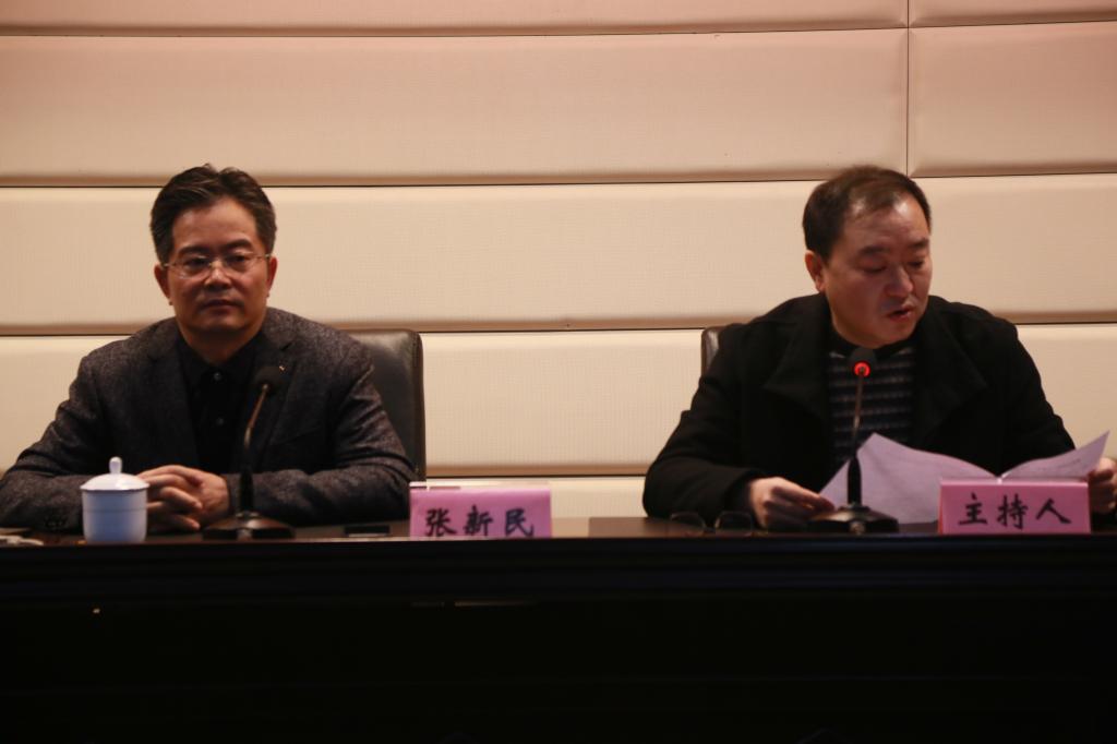 张新民教授(左)做讲座,校党委书记马文华(右)主持会议