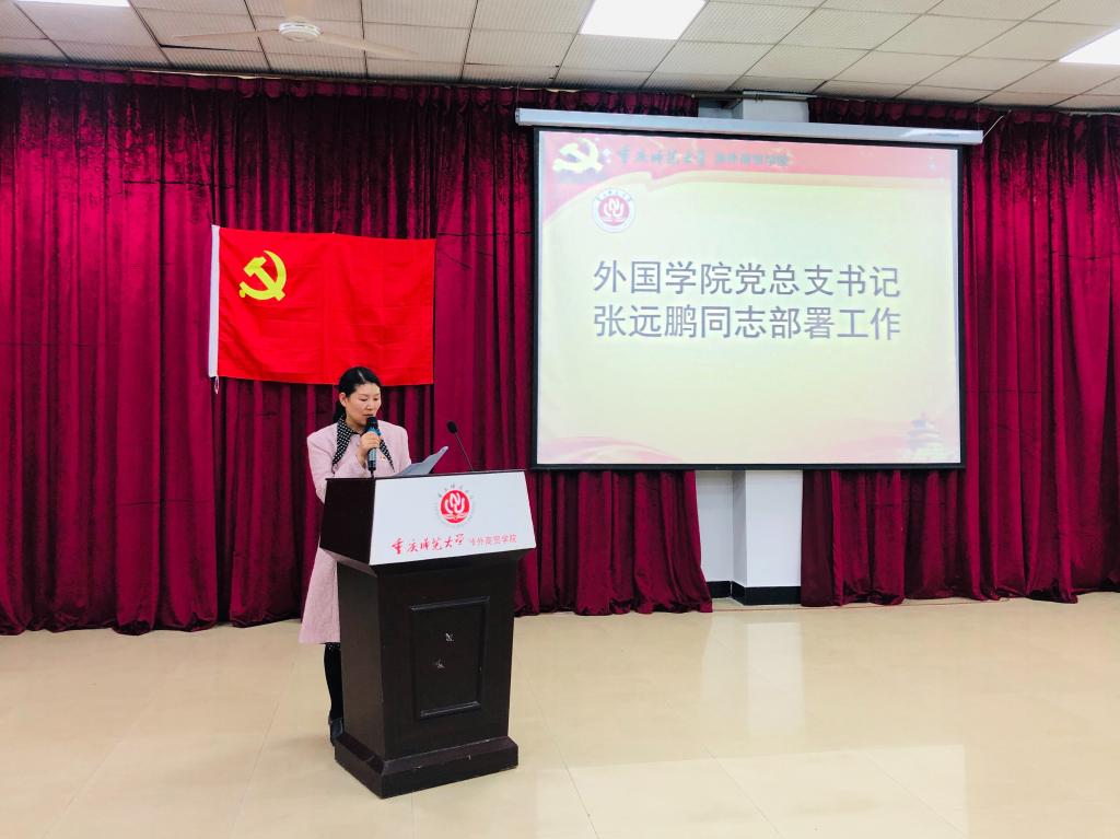 首先,外国语学院党总支书记张远鹏讲话,他强调“不忘初心、牢记使命”的重要性,要深入领会实质,结合工作实际,抓好贯彻落实相关工作。教师党员及学生党员应做到以下硬性要求:一是要增强“学习强国”的理论学习,所有党员同志应紧密团结在以习近平同志为核心的党中央周围,以高度的政治自觉,务实的作风举措,抓好抓实理论学习;二是要积极投身社会实践,教师党员通过实践更好地完成教育与育人相结合;学生党员积极投身社会、身向基层开动脑筋,用实际行动展现当代大学生党员的昂扬风貌。