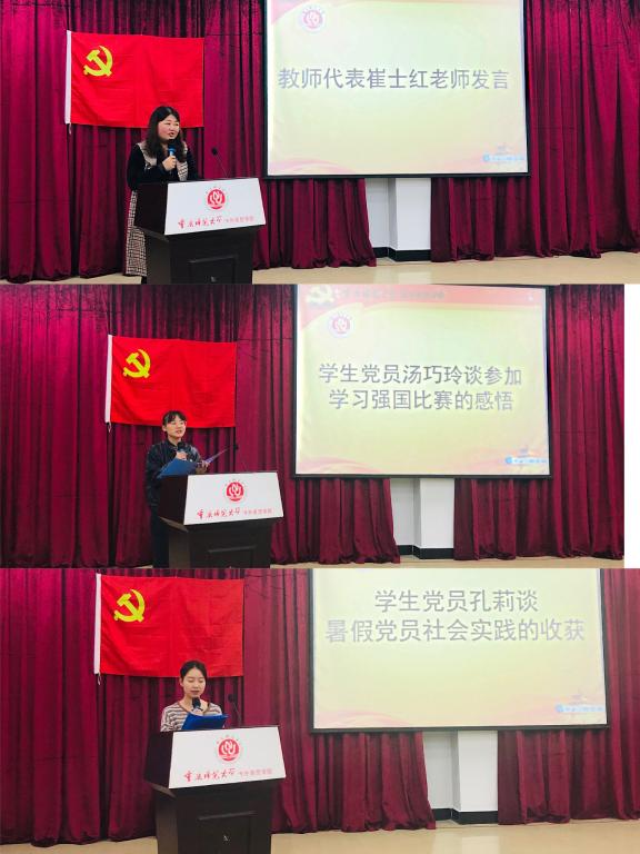 随后,教师代表崔士红同志发言,她分享了自己观看70周年阅兵的感悟,为祖国的强大而感到自豪。当谈到“初心”时,她真诚地讲到作为一名党员教师,我们应该尽职尽责,不断学习和教书育人、引导学生不断前进;紧接着,学生党员汤巧玲同志发言,她从自身出发,谈到对祖国经济、民生方面所作出的巨大改变感到震撼,并分享自己在追逐成为一名优秀人民教师的梦想过程中的初心和坚持。最后,学生党员孔莉同志分享了暑假参加党员社会实践的经历与收获,呼吁每一位学生党员争做一个有担当、有责任、有作为的青年,奉献他人、奉献国家、奉献社会。