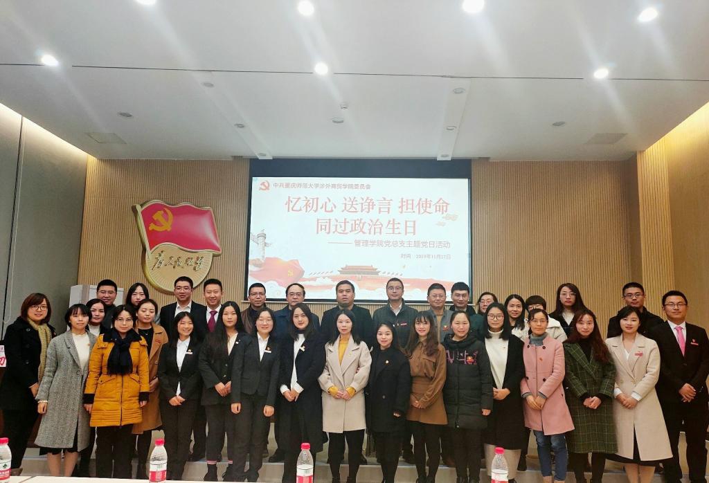 为进一步推进“不忘初心、牢记使命”主题教育,加强党员理想信念教育,充分传递组织的关心和希望,提醒激励党员同志们不忘初心、牢记使命、砥砺前行。我校管理学院党总支于2019年11月27日在9106开展“忆初心、送诤言、担使命,同过“政治生日”主题党日活动,为11月入党的党员同志过政治生日。管理学院院长李安平同志、党群工作部副部长梁修昌同志、政治课教学部部长田川同志、管理学院党总支书记周万春同志、管理学院副院长谭波同志、管理学院全体师生党员、发展对象、入党积极分子代表以及各二级学院党员代表参加了此次活动。