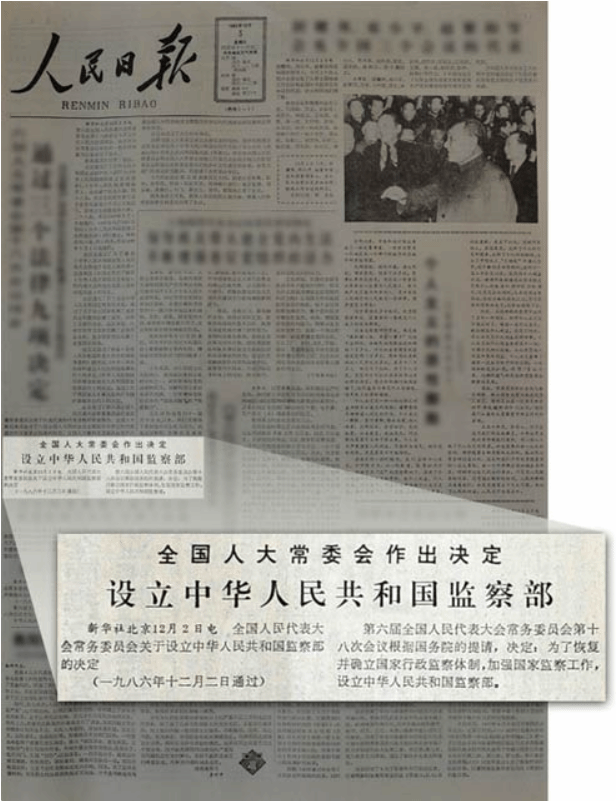 1986年12月3日,《人民日报》刊发设立中华人民共和国监察部的消息。